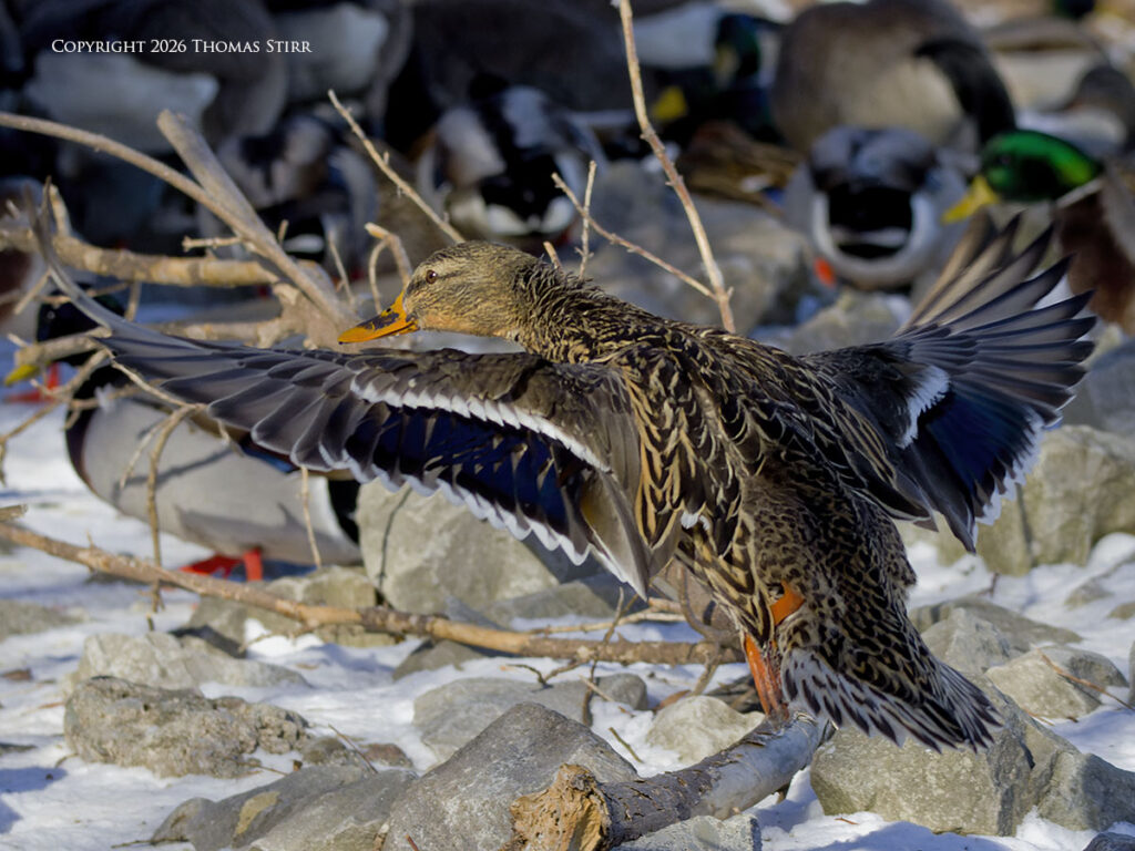 The good thing that comes out of a stretch of cold weather like this is that our local harbour freezes over. This brings a concentration of ducks and geese into a small area.