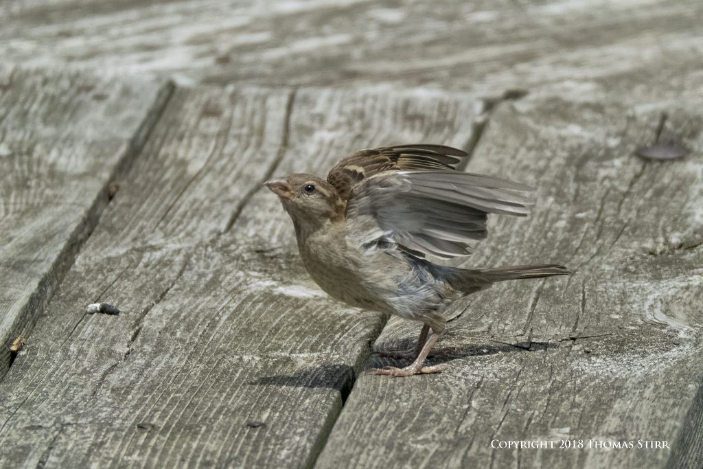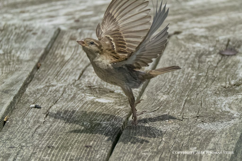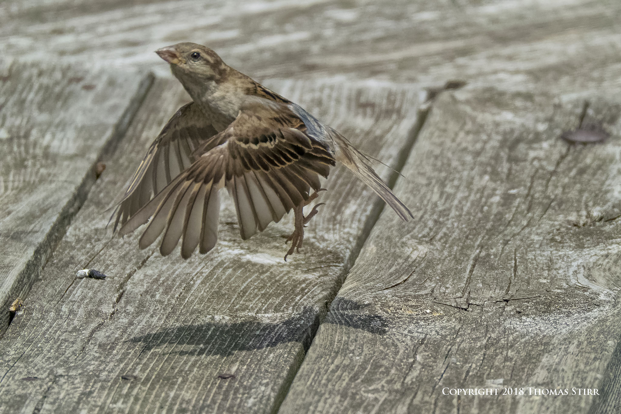 You can see in the image above that the sparrow is beginning to launch itself forward while spreading its wings.