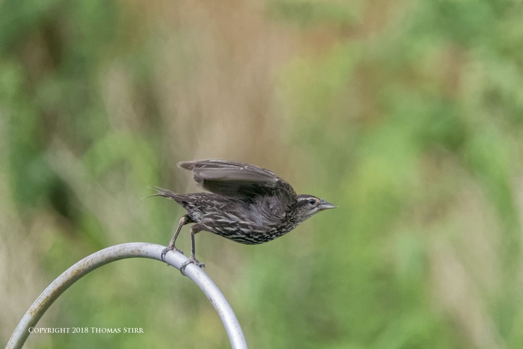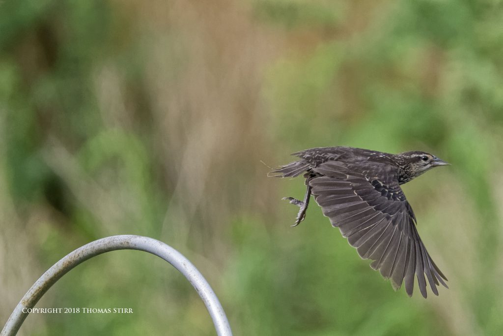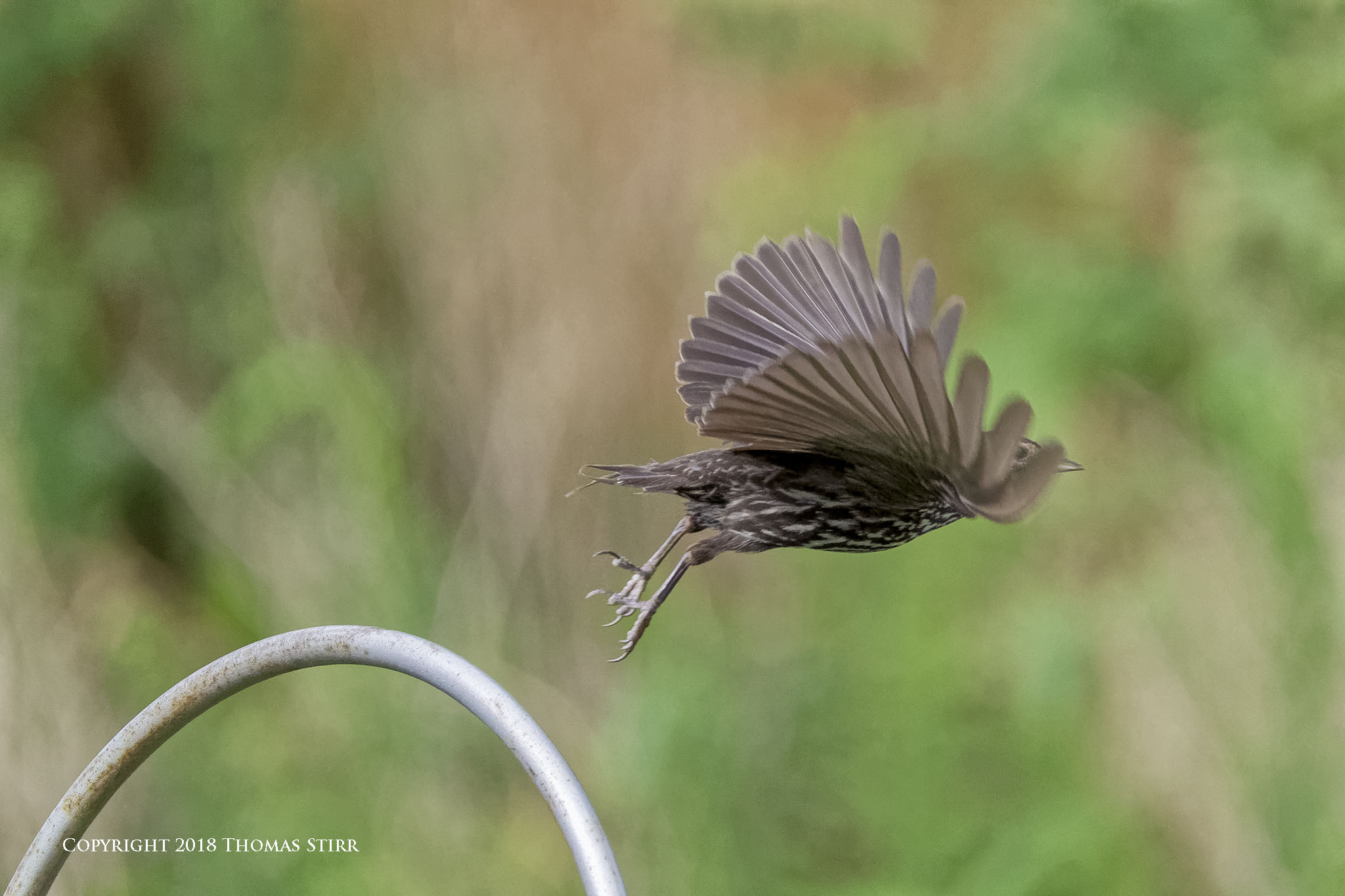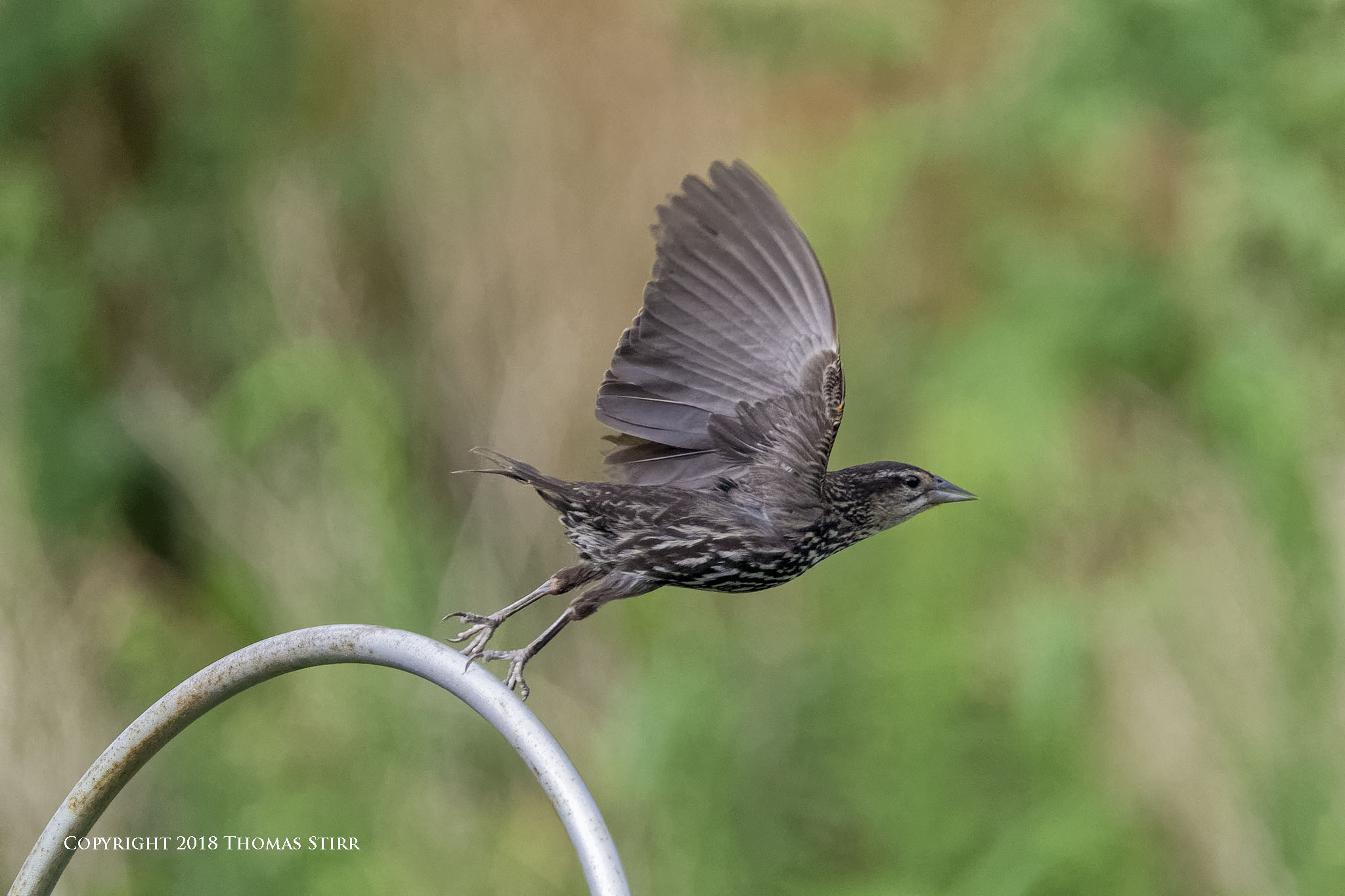 Now, let’s have a look at 5 consecutive images of a small bird taking flight from the top of a shepherd’s pole which was holding a bird feeder. Since this bird was a bit larger I chose a shutter speed of 1/3200. I’m unsure of the bird species – perhaps a reader can help with identification. You’ll notice in the EXIF data that the ISO is also a bit high at ISO-2000. This is because this image series was captured later in the afternoon at about 4 PM under partially cloudy conditions.